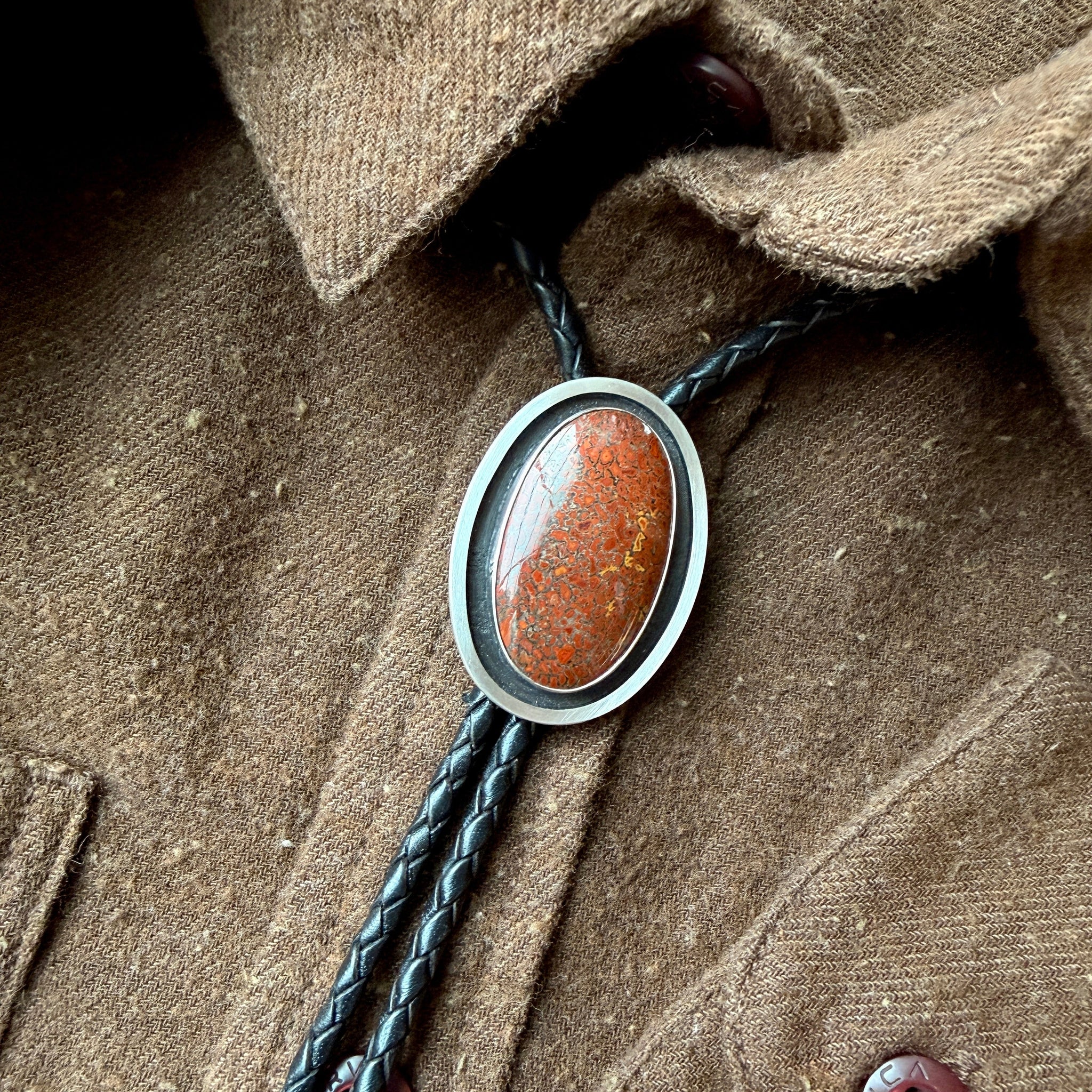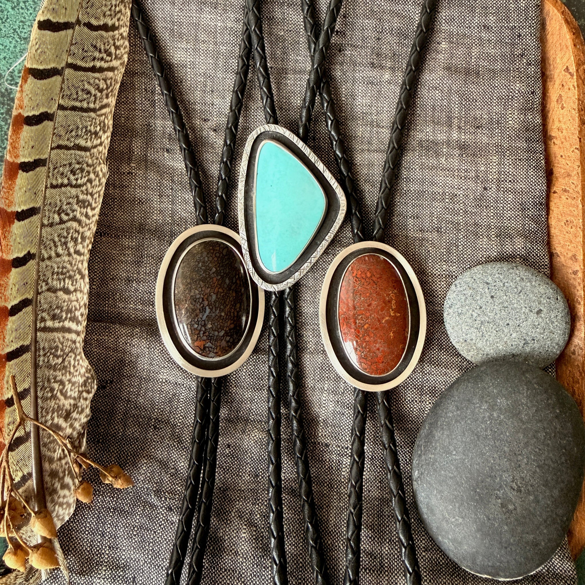 The handmade sterling silver slide on the back smoothly allows the leather to slide through as you move and set your Bolo right where you want it.