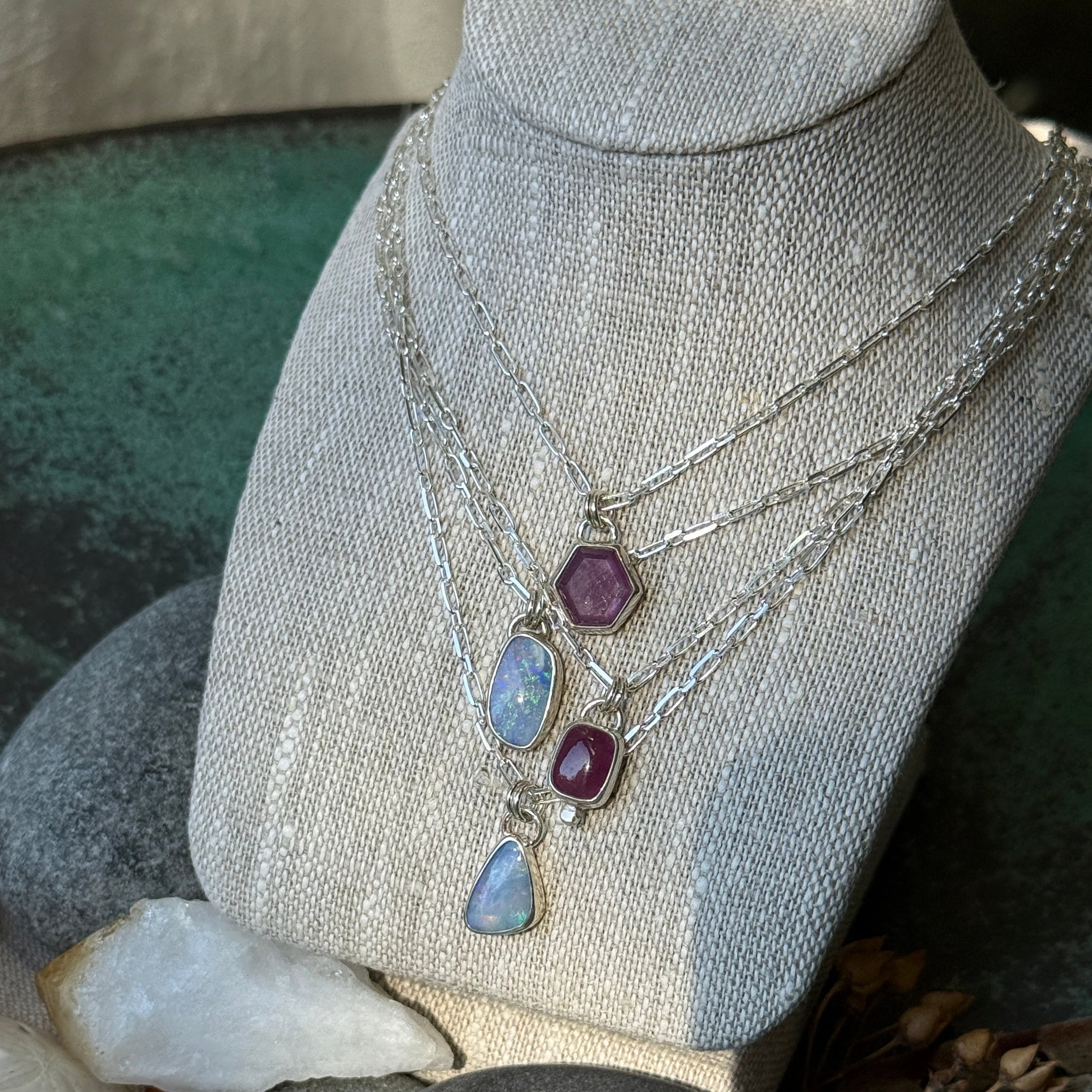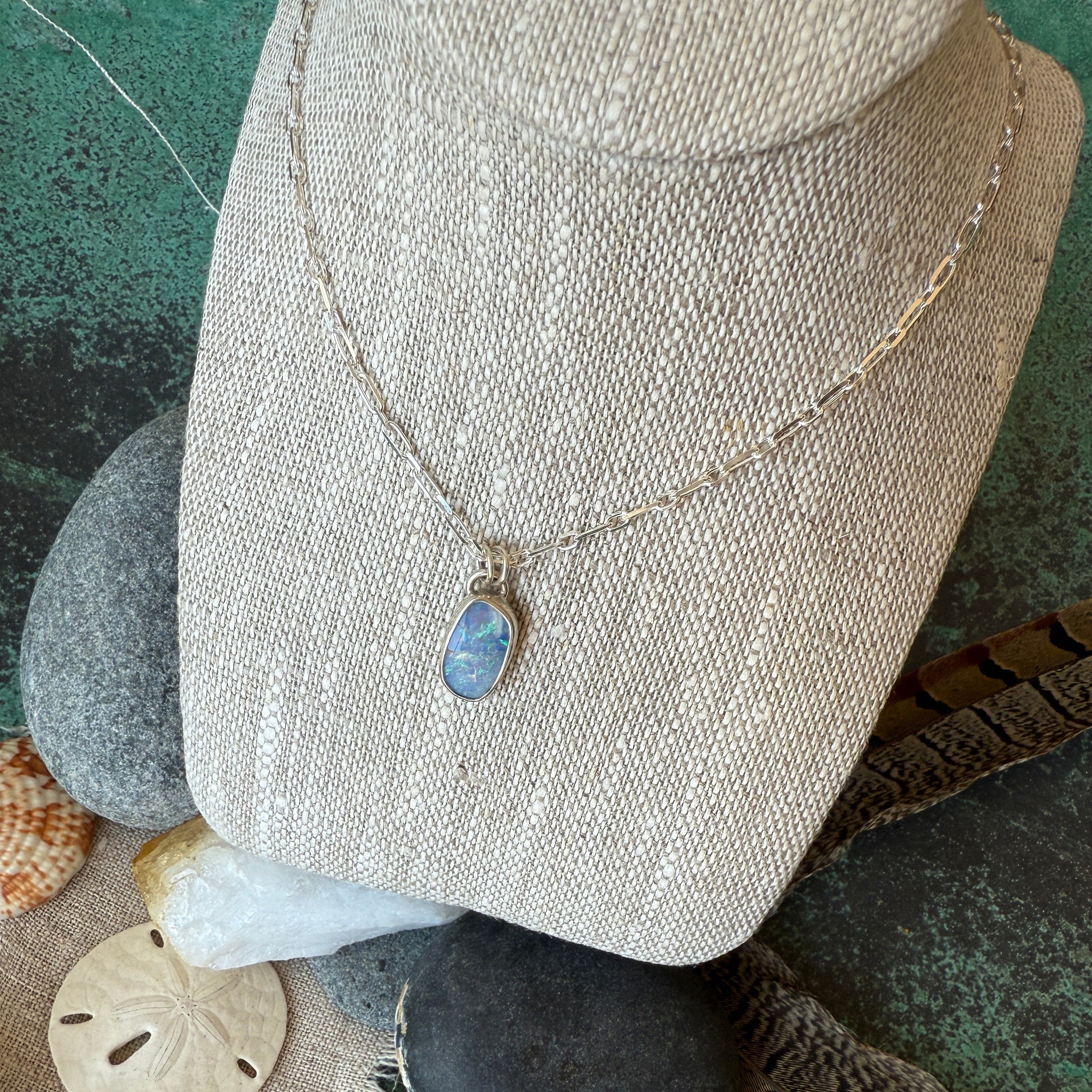 Natural Coober Pedy Opal Doublet Gemstone with a glowing sparkle that flashes as the light catches it. Set in Fine & Sterling Silver